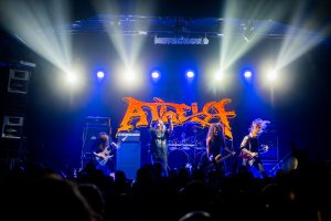 A las 20:00 hrs, subieron al escenario los estadounidenses ATHEIST (Sarasota FL, 1987) reconocidos por su enfoque innovador en el death metal, incorporando elementos del jazz y el rock progresivo. Tras un breve traspié inicial por un problema en un amplificador en una de sus guitarras, la banda liderada por su histórico vocalista Kelly Shaefer inició el show con “No Truth”, un poderoso tema que pertenece a su álbum debut Piece Of Time (1989) y que estableció el tono para la noche. Esta formación de Atheist incluye a jóvenes músicos acompañando a Shaefer: Alex Haddad y Jerry Witunsky en guitarras, Dylan Marks en batería y el mexicano Yoav Ruiz-Feingold en bajo.
