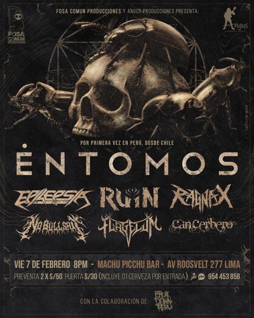 Serán dos fechas las que -hasta el momento- Éntomos brinde en Perú. Primero, el día viernes 7 de febrero en la capital, Lima, y luego el día miércoles 8 del mismo mes en Cusco.