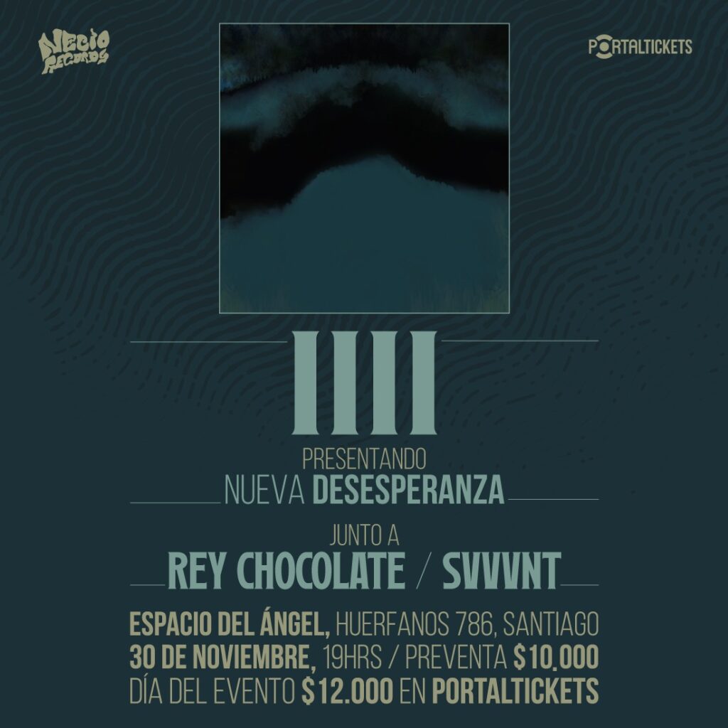 El próximo sábado 30 de noviembre IIII lanzará su tercer larga duración titulado “Nueva desesperanza”, con un show en Espacio del Ángel (Huérfanos 786, Santiago Centro), junto a Rey Chocolate y SVVVNT.