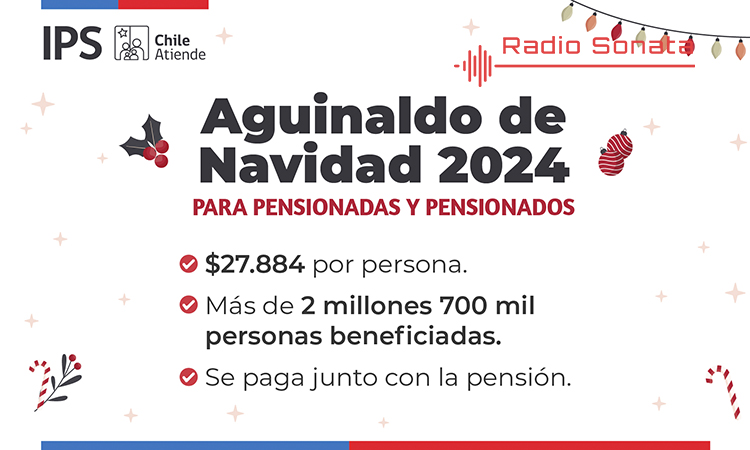 El Instituto de Previsión Social informa que, a contar de este lunes 2 de diciembre, el Estado comienza a pagar el Aguinaldo de Navidad para pensionadas y pensionados. El monto del beneficio será de $27.884 por persona pensionada, el que se incluirá junto con la pensión en la fecha de pago correspondiente a cada persona.