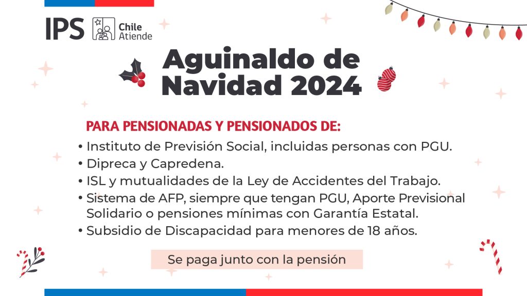 Tienen derecho al Aguinaldo de Navidad los pensionados y pensionadas del Instituto de Previsión Social (IPS), incluidas las personas con PGU; de las Cajas de Previsión de Dipreca y Capredena; del Instituto de Seguridad Laboral (ISL); de las Mutualidades de Empleadores de la Ley N° 16.744 de Accidentes del Trabajo, que tengan alguna de estas calidades al 30 de noviembre del año 2024. El Aguinaldo también beneficia a quienes reciben Subsidio por Discapacidad Mental, Física o Sensorial Severa (Ley N° 21.419).