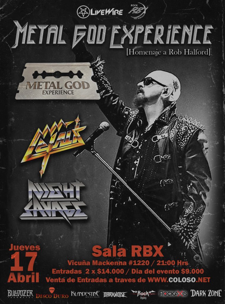 METAL GOD EXPERIENCE es el espectáculo definitivo inspirado en la obra de Rob Halford en sus distintas variantes, encabezado por Rob Díaz y con una selección de grandes músicos de la escena nacional. La cita para este magno evento cargado del más puro Heavy Metal es en SALA RBX (Vicuña Mackenna 1220-Ñuñoa) el jueves 17 de abril (viernes feriado) a partir de las 21 horas puntual; promete ser una verdadera fiesta del metal pesado, siendo la previa perfecta para el regreso de JUDAS PRIEST a Chile la semana siguiente.