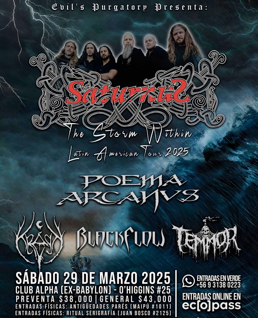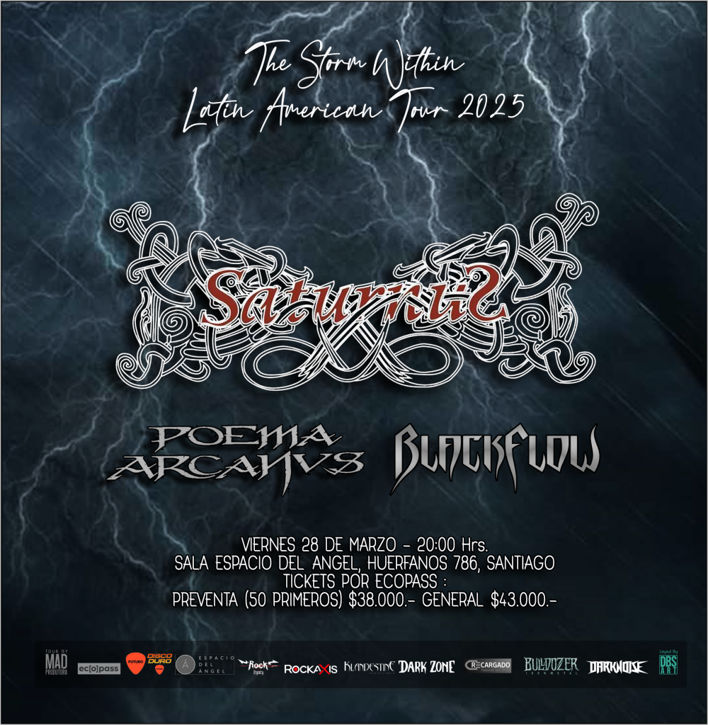 En SANTIAGO, la banda que acompañará a SATURNUS y POEMA ARCANVS, son el quinteto capitalino Epic Doom/Heavy Metal, BLACKFLOW, desde 2016 en la escena nacional y un álbum titulado Seeds of Downfall, trabajo que obtuvo muy buenas críticas y la recepción de nuevos seguidores, en especial en Alemania y Chile. Este evento se llevará a cabo este 28 de marzo de 2025 en Sala Espacio del Ángel, Santiago, Huérfanos 786 esquina San Antonio. Preventa: $38,000 más cargos de Ticketera. General: $43.000 más cargos de Ticketera. Venta de entradas en: https://www.ecopass.cl/events/saturnus-the-storm-within-tour-santiago-chile/11860?
